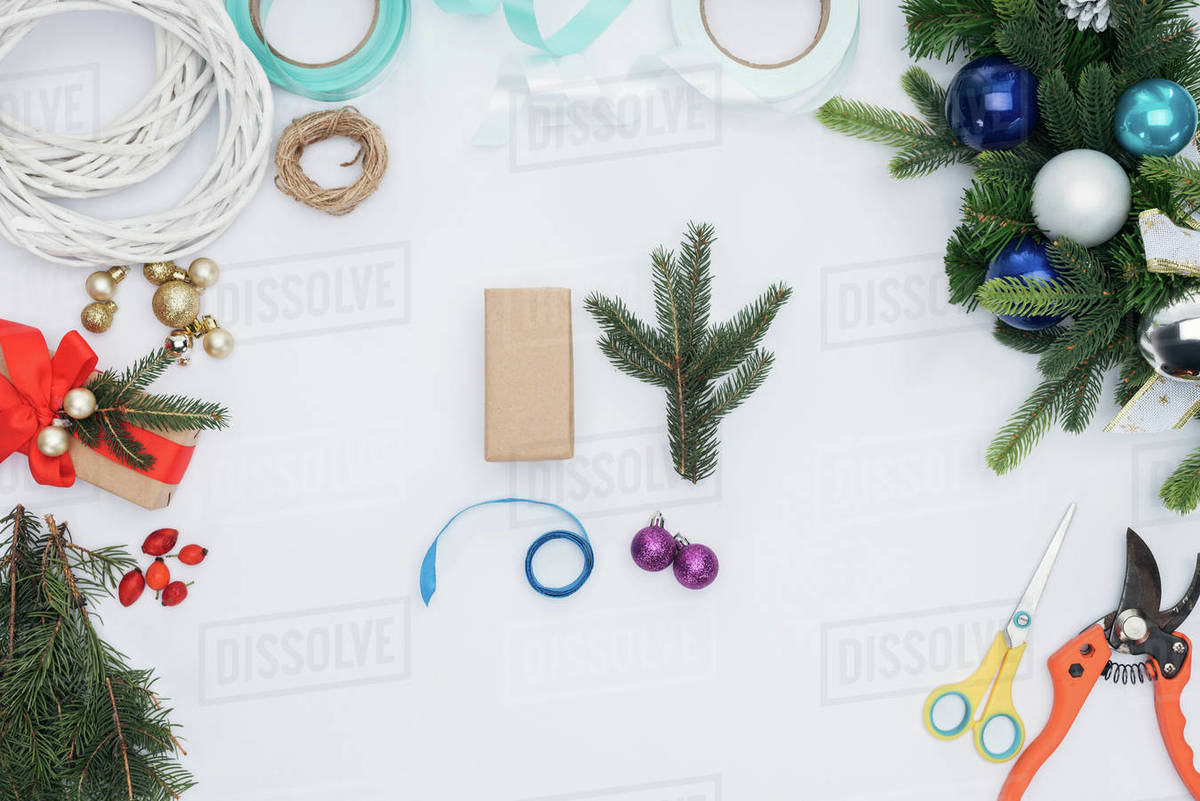 Top View Of Wrapped Christmas Gifts Pine Tree Branches And