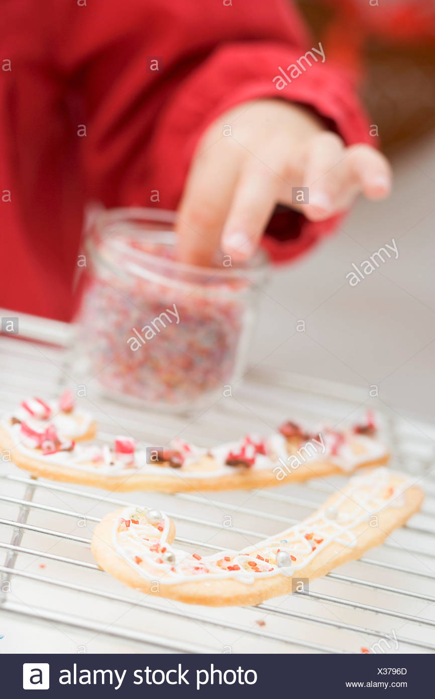 Child Decorating Christmas Biscuits With Sprinkles Stock Photo