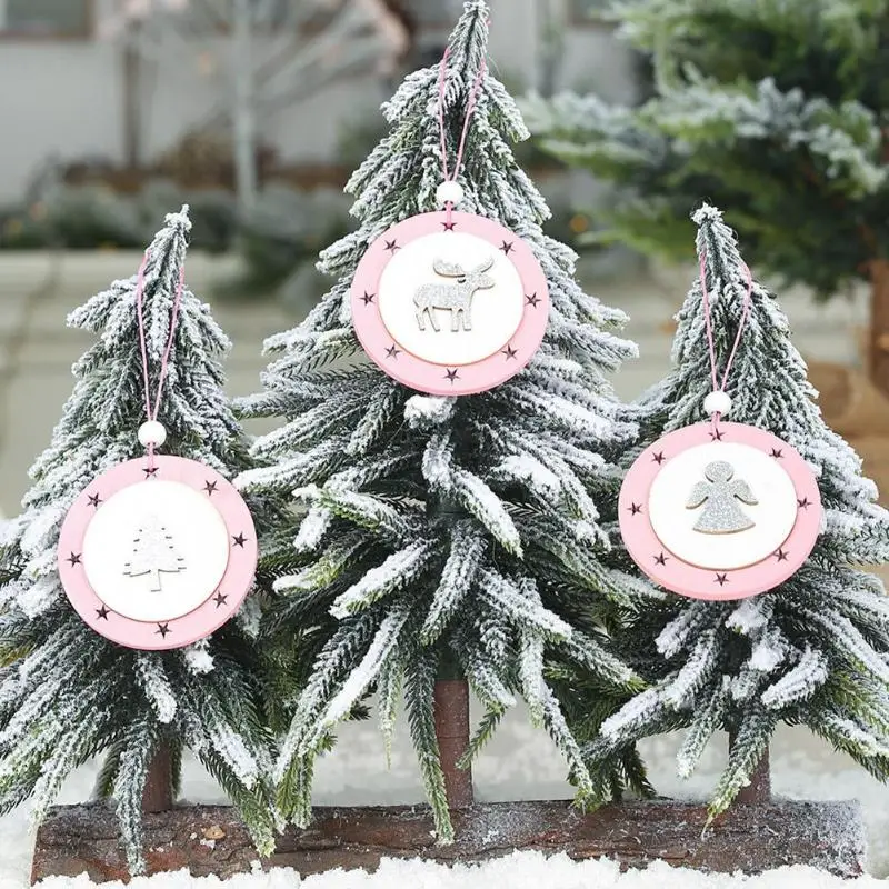 Pink Round Shape Christmas Pendant Wooden Printed Ornament Home
