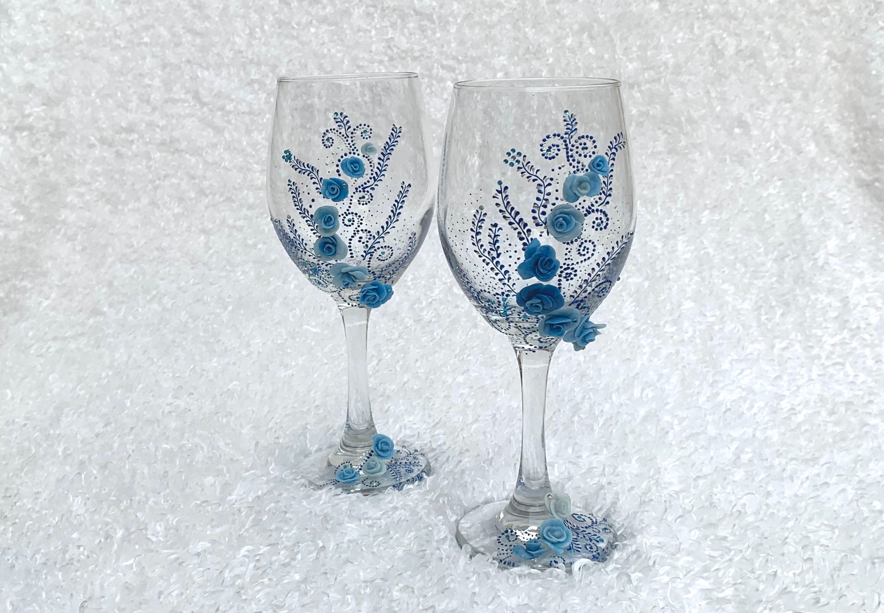 Decorated Wine Glasses Blue Roses Flowers Toasting Glasses Etsy