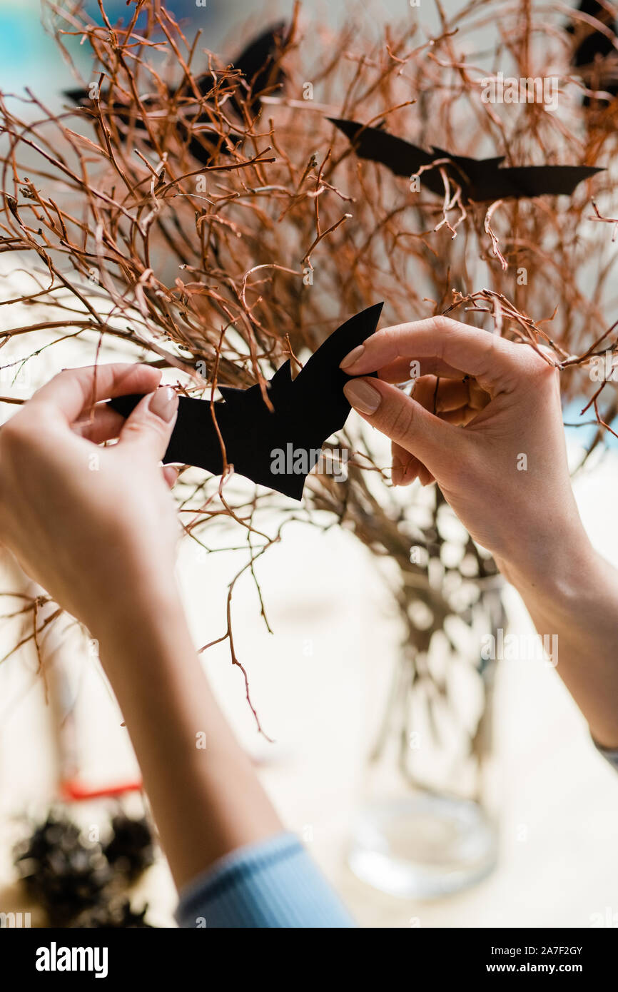 Human Hands With Black Paper Bat Decorating Dry Branches For