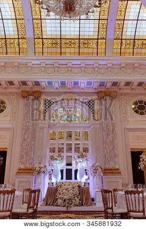 Bride And Groom Table Set For A Dinner Party Or Wedding Reception
