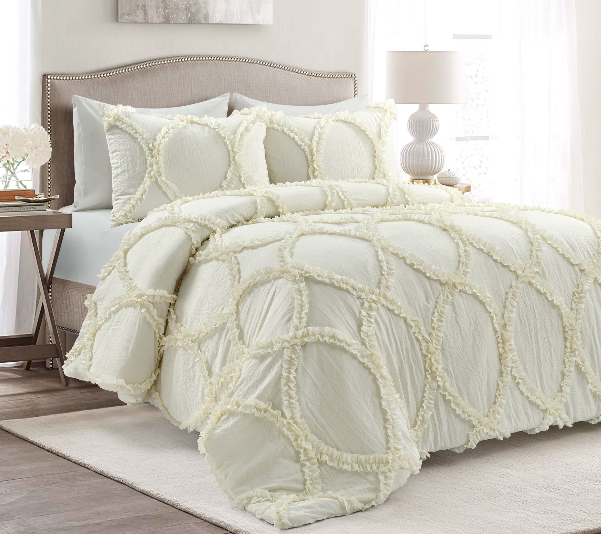 Belle comforter ivory 4pc set queen belle is the essence of frilly and pretty. Quality bedding from lush decor will encourage a restful sleep every night.