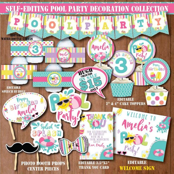 Self Editing Pool Party Decorations Printable Pool Birthday Etsy