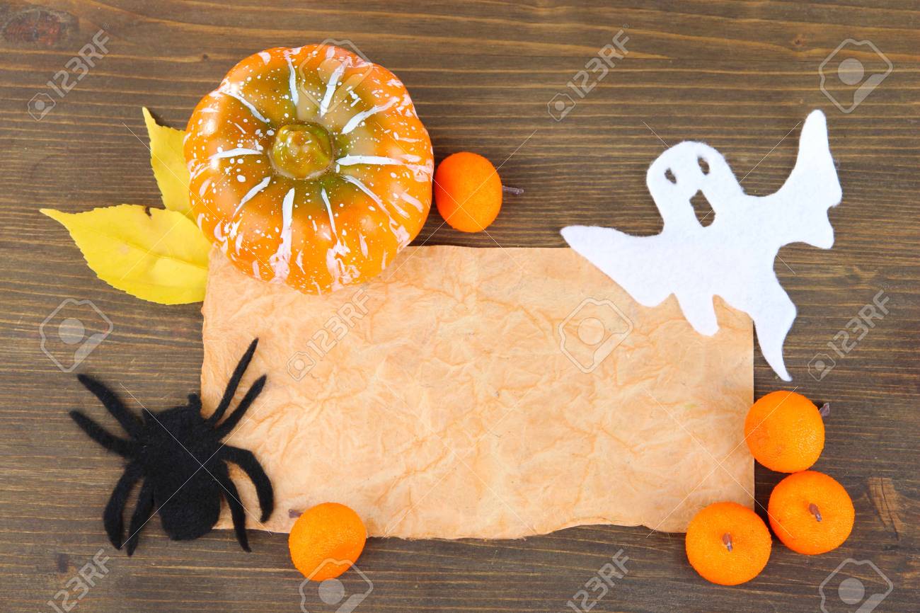 Old Paper With Halloween Decorations On Grey Wooden Background
