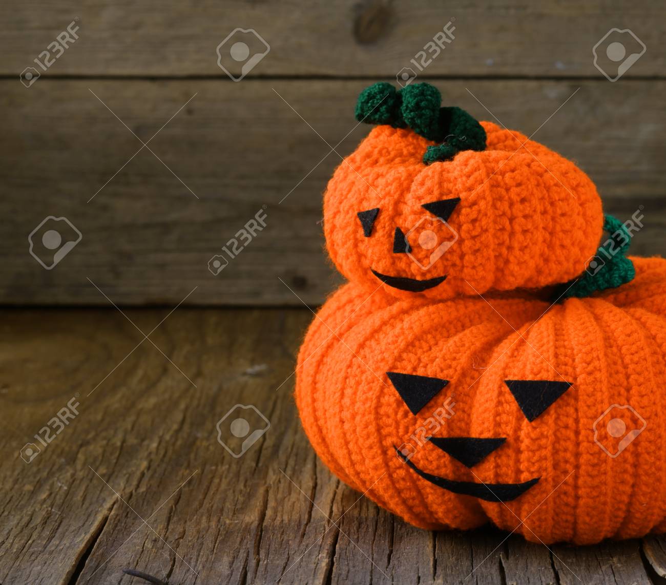 Knitted Pumpkins For Halloween Decorations Holiday On A Wooden