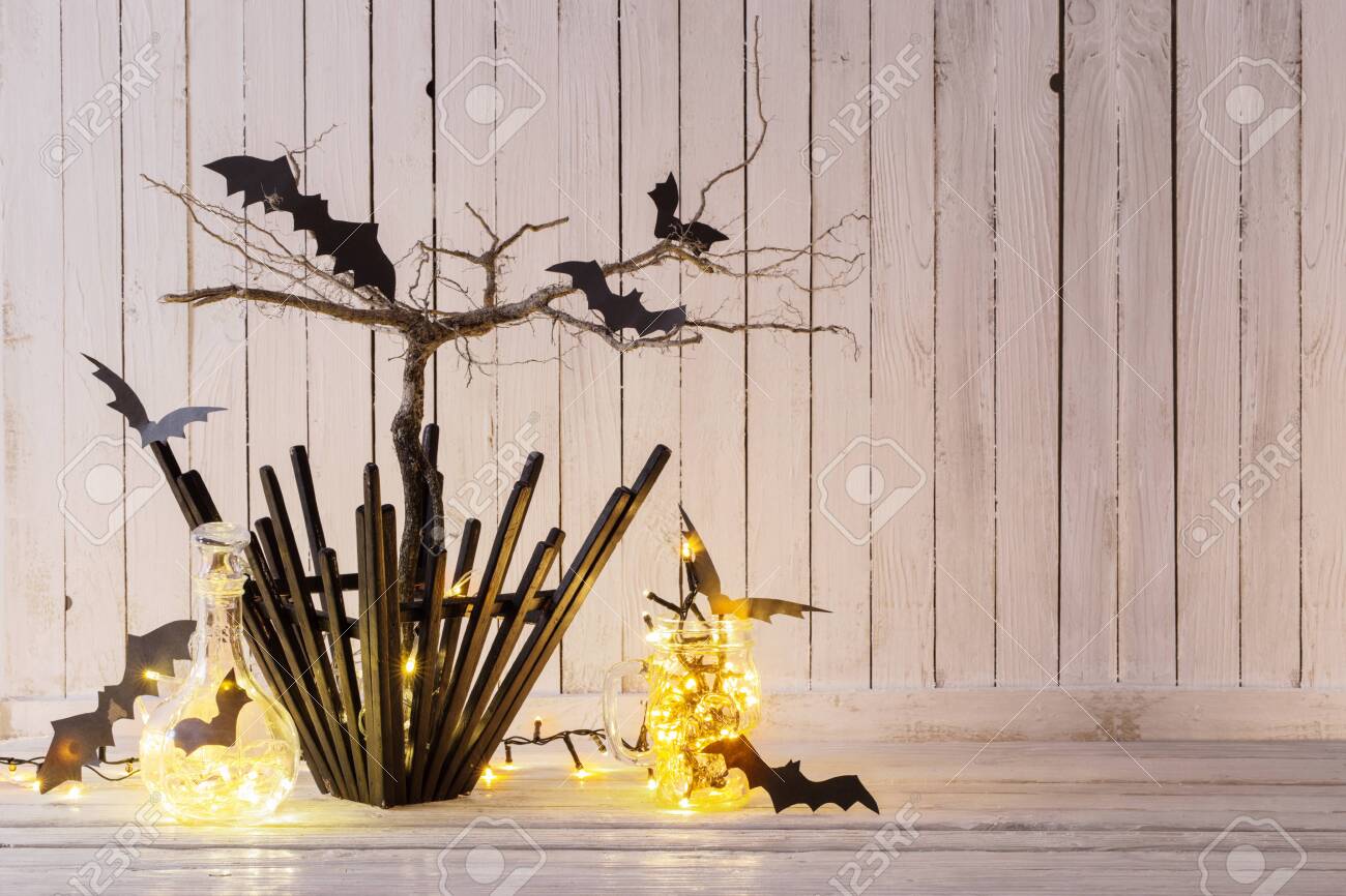 Halloween Decorations On Wooden Background In Home Stock Photo