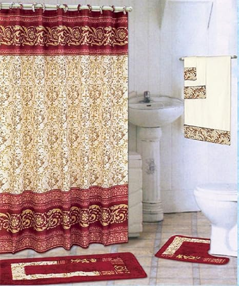 Buy Burgundy 18 Piece Bathroom Set 2 Rugs Mats 1 Fabric Shower
