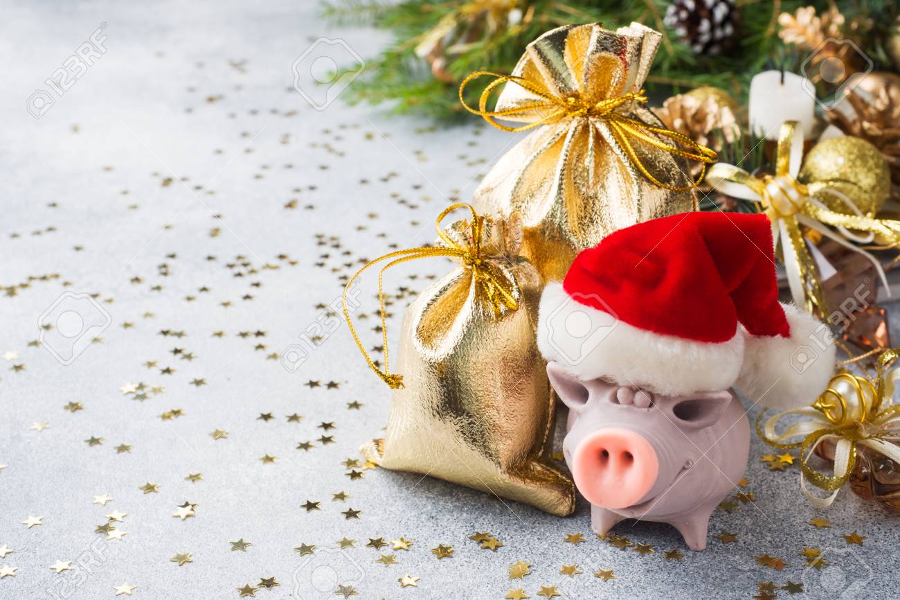 Symbol 2019 Pig Stands On The Background Of Christmas Decorations