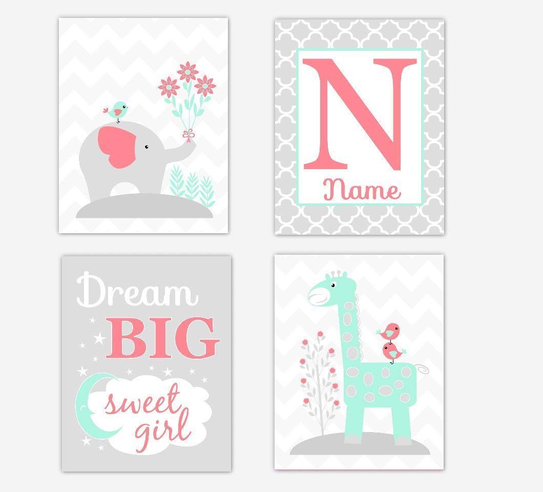 Amazon Com Coral Baby Girl Nursery Art Mint Green Elephant