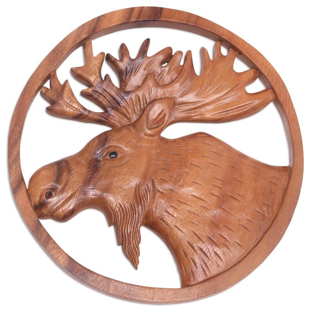 Novica Moose Portrait Wood Relief Panel Rustic Wall Accents