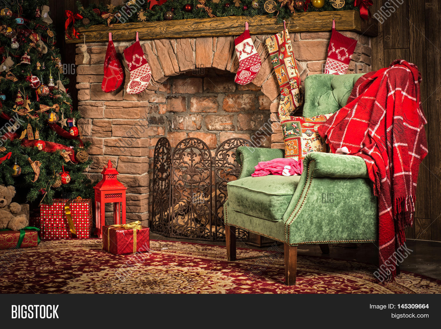 Wooden Rocking Chair With Christmas Decorations Stock Photo