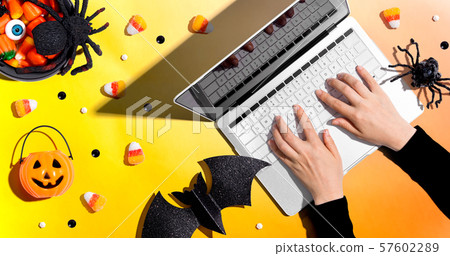 Halloween Decorations With Person Using A Stock Photo