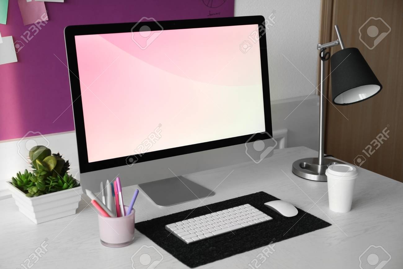 Stylish Workplace With Computer And Interior Decorations Stock