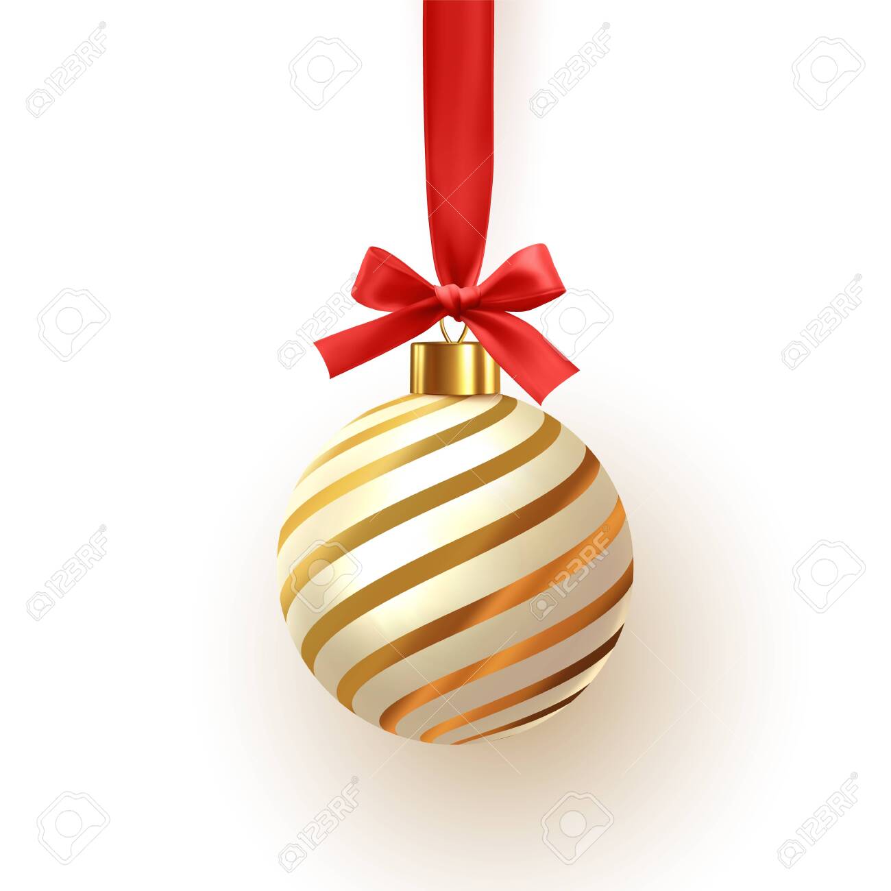 Christmas Ball Hanging On Ribbon With Red Bow Decor Xmas Bauble