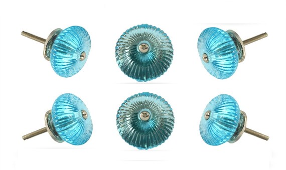 Set Of 6 Ribbed Blue Glass Decorative Door Knobs For Kitchen Etsy