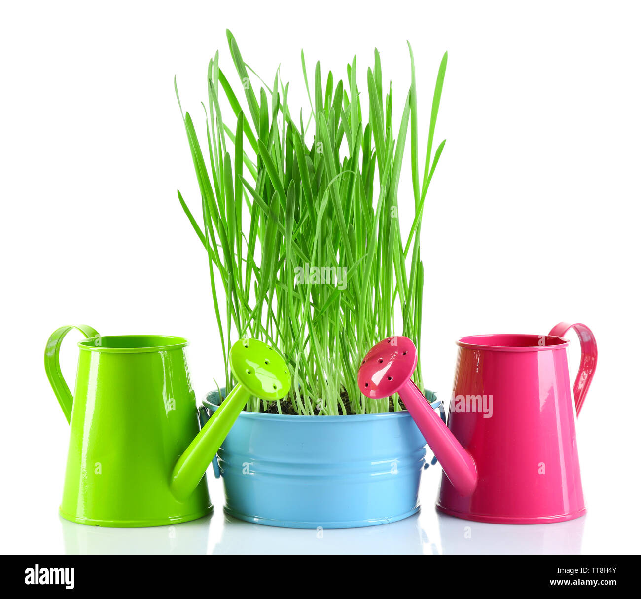 Fresh Green Grass In Small Metal Bucket And Decorative Watering