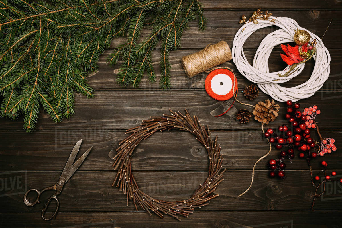 Top View Of Creation Of Wreaths With Fir Twine And Christmas