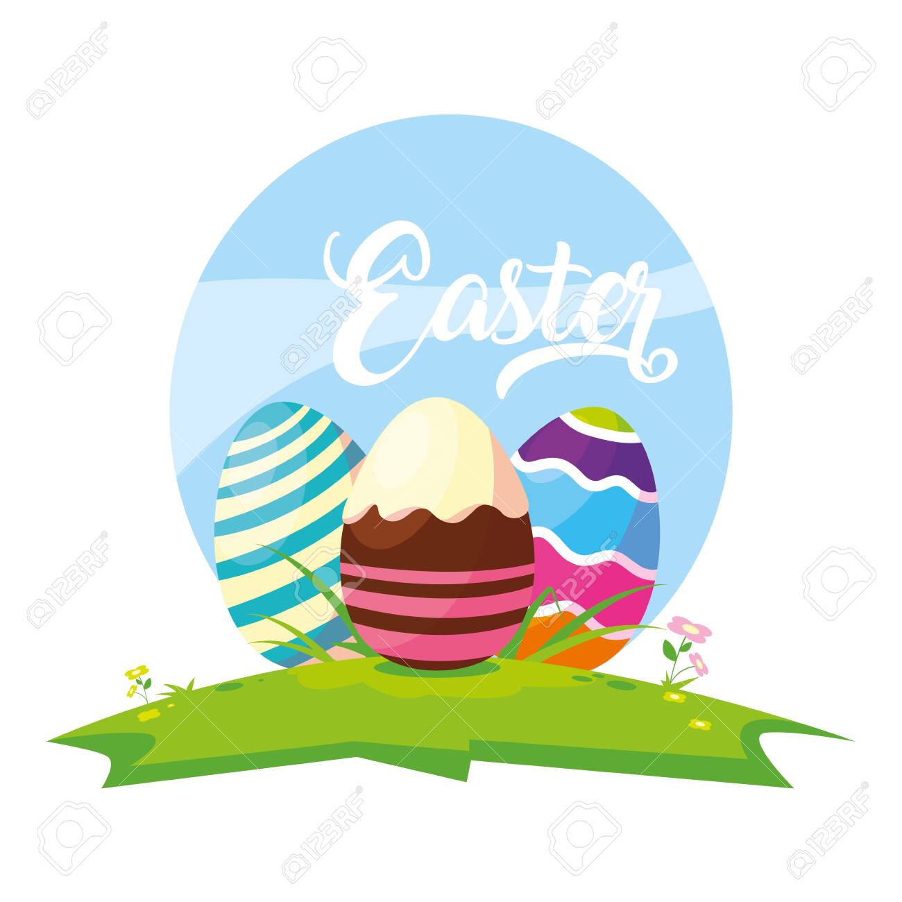 Set Of Decorated Easter Eggs With Candies In Grass Vector