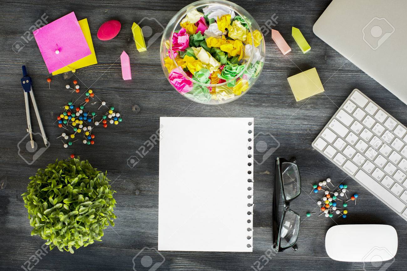 Top View Of Dark Wooden Desktop With Blank Paper Sheet Decorative