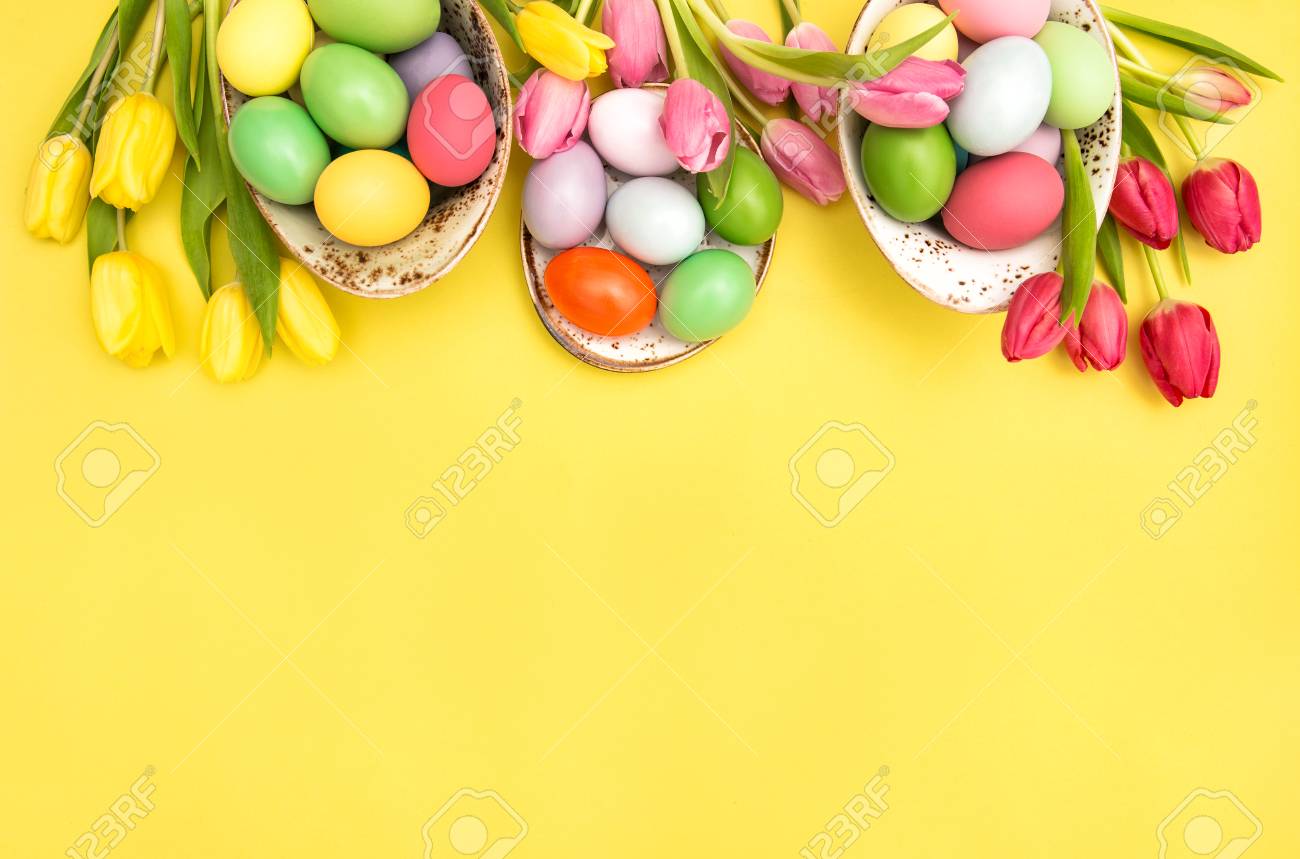 Easter Eggs Decoration And Colorful Tulip Flowers On Yellow