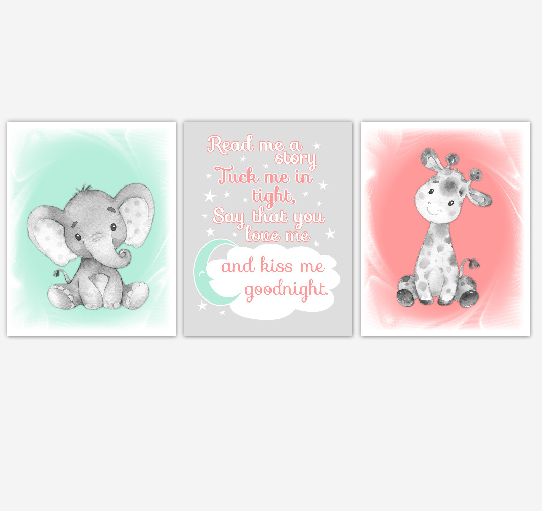 Safari Animals Baby Girl Nursery Decor Coral Mint Green Wall Art