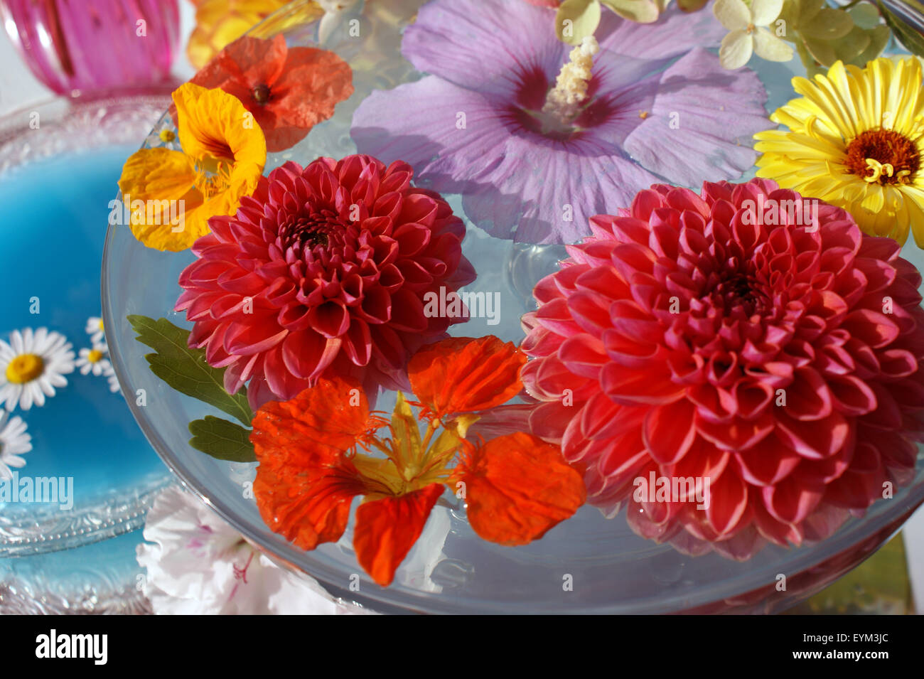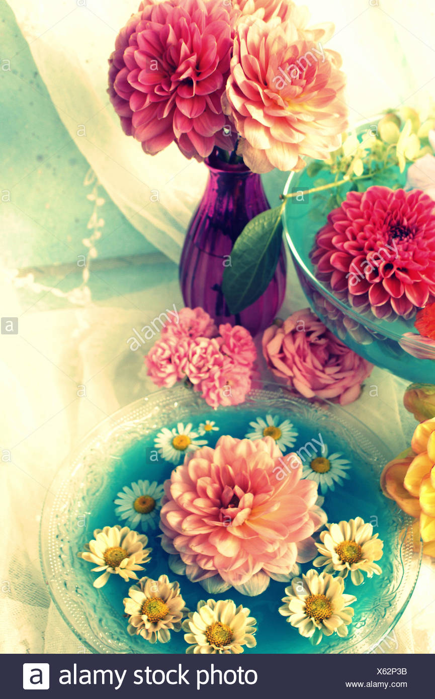 Table Decoration Coloured Blossoms And Water Bowl Stock Photo