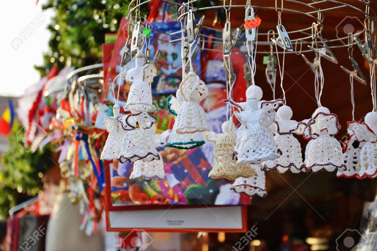 Crocheted Handmade Christmas Decorations Hanged At A Stand At