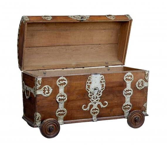 18th Century Oak And Metal Bound Trunk On Wheels Etsy