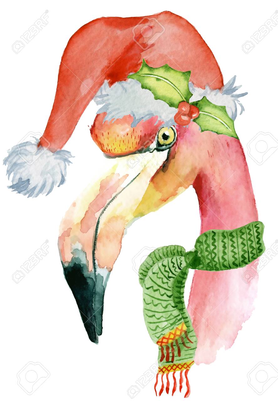 Christmas Pink Flamingo With Winter Decorations Santa Hat And