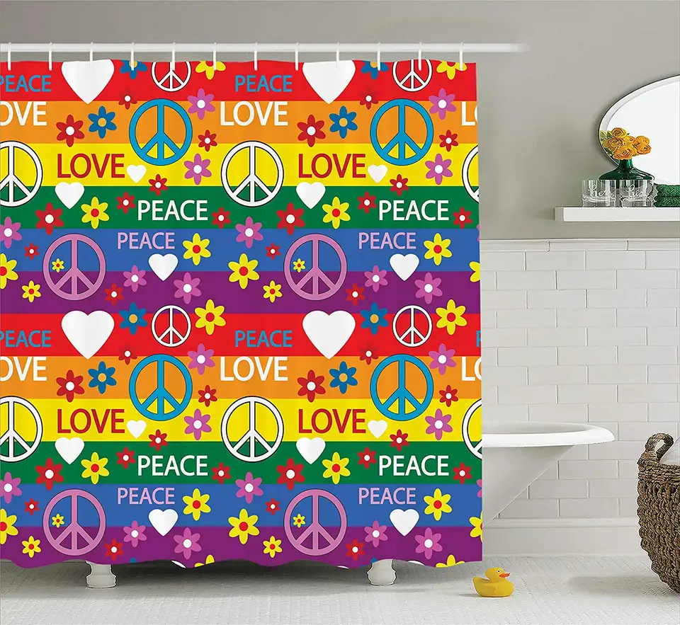 Inspirational Shower Curtain Hippie Decor Heart Peace Sign Flower