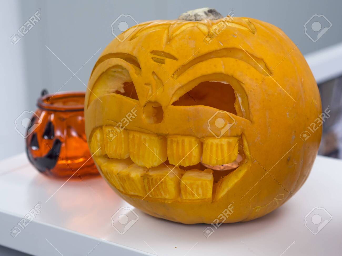 Halloween Big Orange Pumpkin Decorated With Scary Face Jack