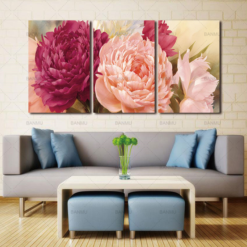 3 Panel Pictures Canvas Painting Wall Art Peony Flower Painting