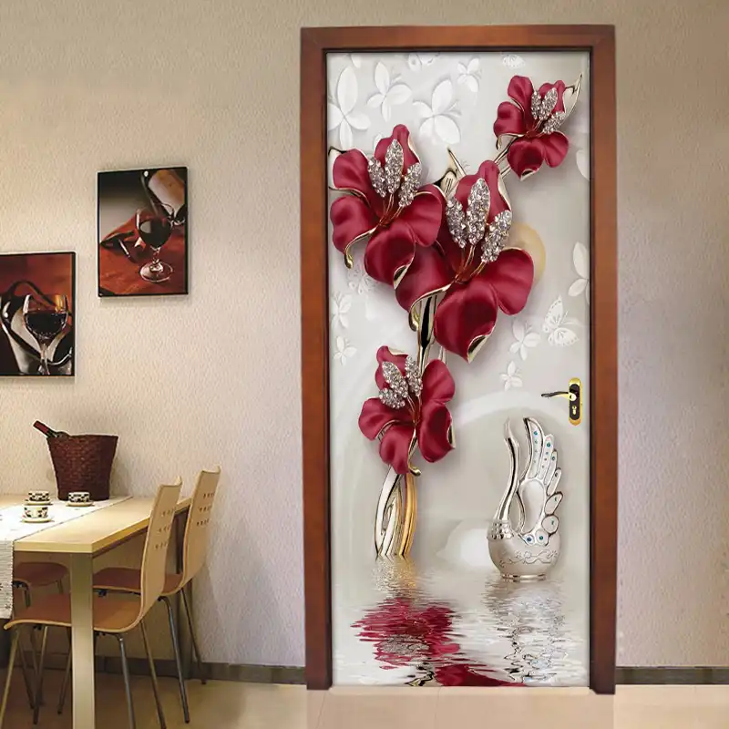Red Flower Butterfly Jewelry 3d Door Stickers Home Decor Modern