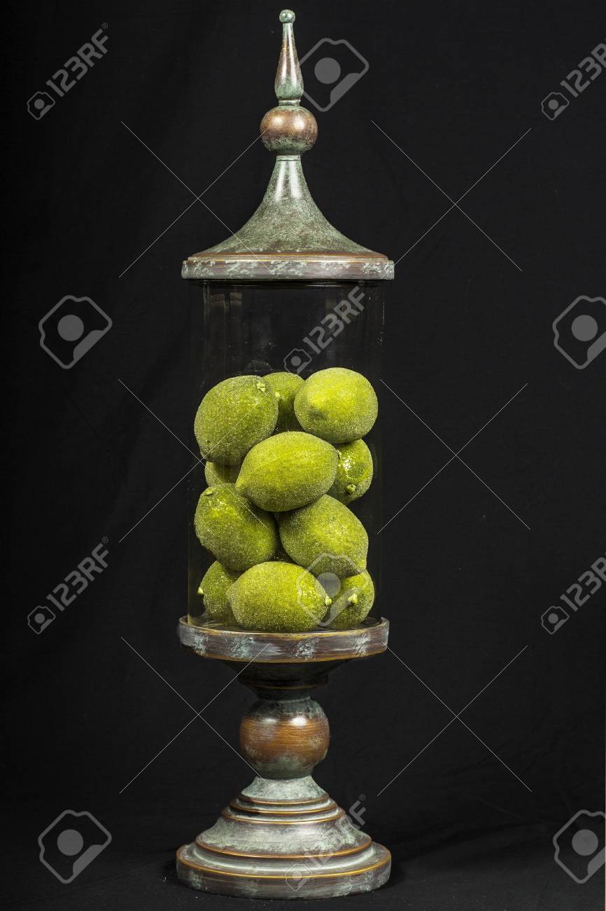 A Decorative Vintage Glass Jar Filled With Limes Stock Photo